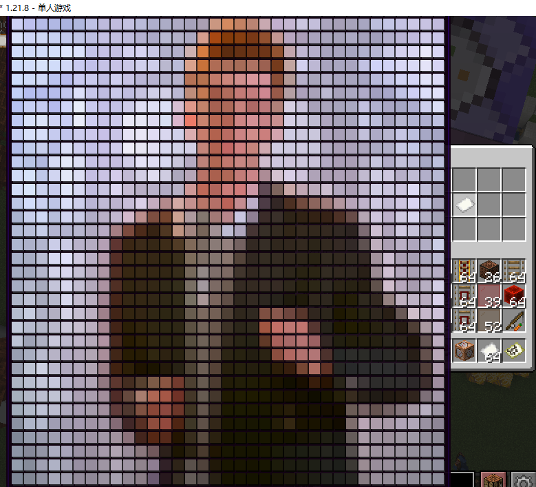 这估计是最普通的像素画了,原理是用程序生成一个mcfuntcion函数文件,里面全是setblock命令,然后执行这个函数即可,这个程序可以生成立体地图画,放在当时可以算是很超前的,不过现在有了更好的软件:SlopeCraft BV1So4y1D7wB