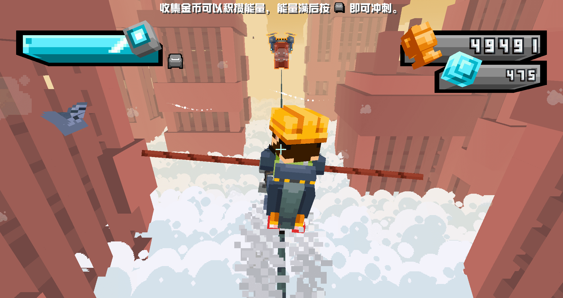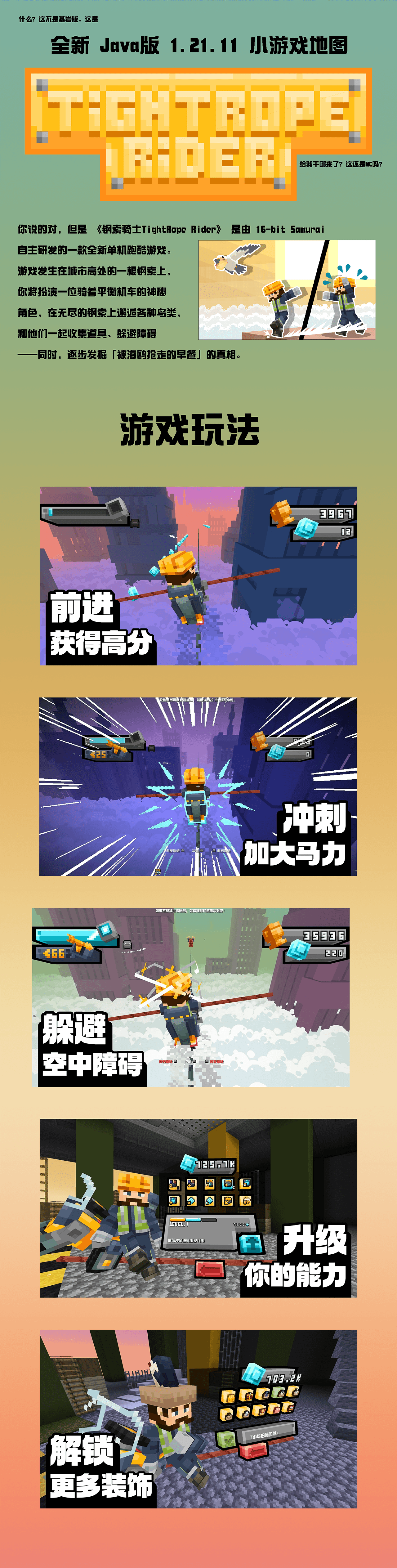 这是一张跑酷小游戏地图,你将在无尽的钢索上保持平衡,收集道具,躲避障碍,并邂逅各种鸟儿。